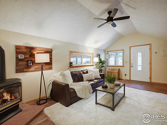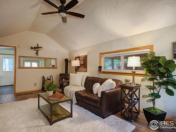Perched on a forested parcel with easy access to Highway 7, this charming, updated cabin provides comfort and access to some of the most wonderful recreational wonders in the region. Large living room with fireplace and high ceilings, a spacious kitchen with lots of counter area, cabinets and a separate dining area plus bedroom with rustic barn door and 3/4 bath. Keep your car protected from the elements under the covered car port. Put your garden tools and snow shovels in the additional garden shed. Durable metal roof. Enjoy a beer on the quiet back patio. This gorgeous location in the South St. Vrain Canyon corridor is within a short and stunning canyon drive to Lyons, Allenspark, a day trip to the recreational wonders of Rocky Mountain Park or the Peak to Peak Highway to see the changing aspen leaves in the fall. The S. St Vrain River is just across the road. Great vacation home or rental potential. Home is serviced by a large cistern and also has supplemental outside watering through St. Vrain augmentation program. Assumable FHA loan, see listing agent for details. Great value for this location!