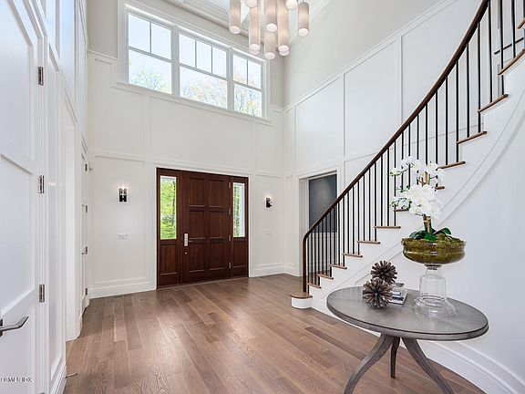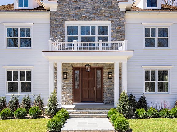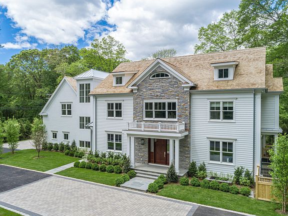 Sophisticated new construction with Smarthome capabilities, 10' plus ceilings, an open floor plan and quality finishes, located on a cul de sac just minutes from Greenwich Ave. 7 BR with 7 ensuite BAs and 2 powder rooms. Over 10,500 sq ft includes 4 finished floors (1st Flr: 3,695 sf, 2nd Flr: 3,225 sf, 3rd Flr: 1,410 sf, Lower Level: 2,635 sf). The double height foyer with elegant millwork leads to an open kitchen and family room with fireplace, and adjoining living room with striking floor to ceiling stone fireplace. Oversized windows and doors, and beamed and vaulted ceilings give this home a grand feeling. Custom closets, master suite with luxe bath, and spacious finished lower level. The stone terrace with fireplace overlooks the level fenced yard. Pool site and room for a pool house.