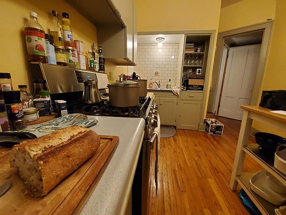 Renovated one bedroom in great home. This apartment has hardwood floors throughout (tiled bath). Large windows provide a light and airy feel. Kitchen has been renovated with restored metal cabinets. Bedroom is down several steps for interest and charm. Apartment comes with basement storage and off street parking. Coin-op laundry in basement. Owner pays water/sewer, gas (heat and stove), lawn maintenance, snow removal. Tenant pays electric and trash.