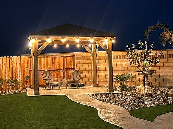 This home provides 1,894 sqft. With form & function in mind, amenities include quartz counter tops in the kitchen & bathrooms. Vinyl plank flooring throughout. Towering 9ft ceilings throughout the home. The ceiling fans add comfort to all bedrooms, great room and option room. Stainless steel freestanding stove, dishwasher, and microwave/hood vent. The split floor plan provides privacy with a master suite featuring a double vanity, 5 ft soaking tub and 5 ft tiled shower, walk-in & privacy closets. The front option room has the potential to be built as 4th bedroom, den or office.There is an indoor laundry room. 2 car garage has automatic opener for the insulated vehicle roll-up door. R-38 insulation in the conditioned attic and R-19 in the 2 x 6 walls. 96% hi-efficiency forced air heater. Ground mounted AC unit Seer 14. Natural gas tankless water heater. Energy efficient windows & lighting. Fire suppression system in the ceiling. A fully trussed covered patio helps to keep it cool. Block wall at east and south side. North fence will be wood. Patio has been extended for additional shade. A custom upscale pool with fountains and Baja shelf and in water table with seating was built and completed in 2022 along with beautiful stamped concrete patios, rv access, iron gate, and retaining wall. The extra large backyard has been landscaped with artificial turf, palm trees, and river rock for a beautiful low maintenance, low water efficient oasis feel with beautiful private gazebo. The front yard also features beautiful low maintenance xeriscape and a large stamped concrete patio that features views of the Sierra Nevada Mountains.