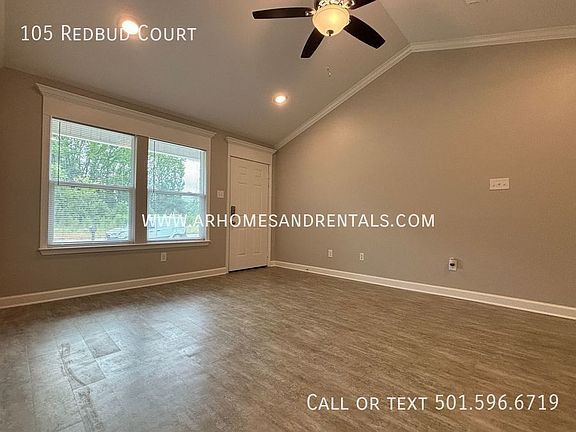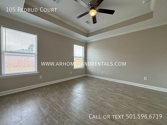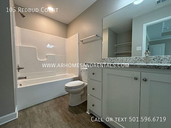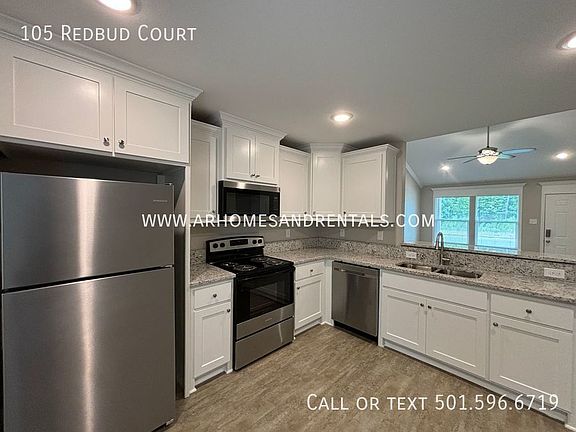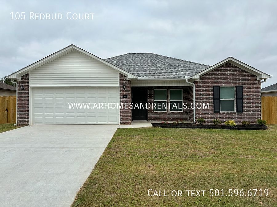 Welcome to 105 Redbud Court in Jacksonville, AR! This newly constructed 3 bedroom, 2 bathroom home offers modern amenities and stylish finishes. The all-electric house features central heat and air, stainless steel appliances including a dishwasher, refrigerator, electric stove, and microwave. Enjoy the convenience of granite countertops, a walk-in closet, ceiling fans, and a 2 car attached garage for parking. The property also includes a utility room with washer/dryer hookups and storage, a pantry, and a patio for outdoor entertaining. The master bath provides a luxurious retreat, while the fenced-in back yard offers privacy and security. With a spacious yard and pet-friendly policy, 105 Redbud Court is the perfect place to call home.