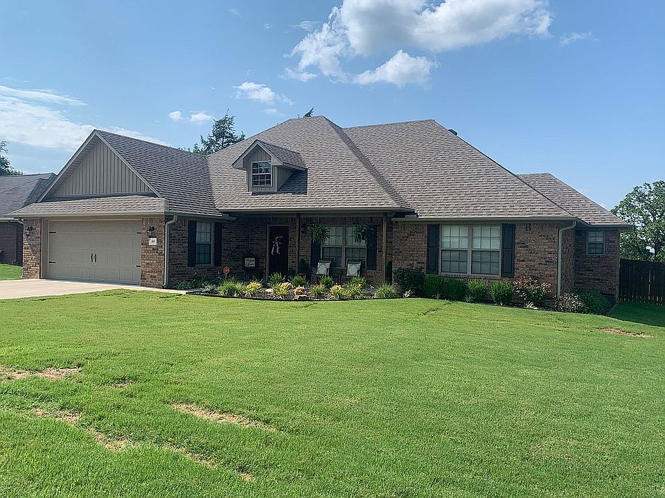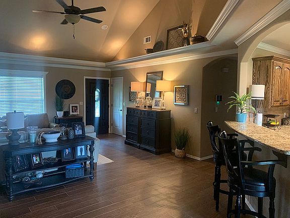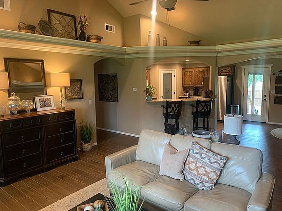 Beautiful open floor plan featuring vaulted and tray ceilings, crown molding, granite countertops, stainless steel appliances, large primary bathroom with whirlpool tub and wrap-around closet, sprinkler system, and landscaping with French drains. Covered deck with pergola added in 2019. Privacy fence installed in 2020.