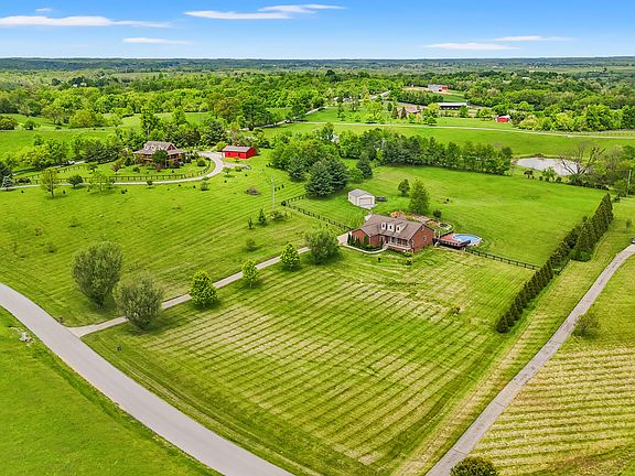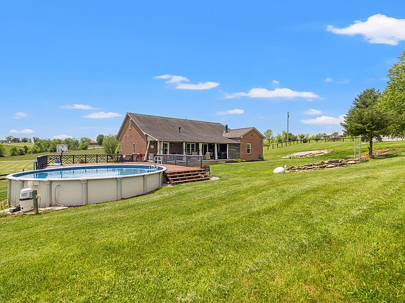 Welcome to 105 Rolling Ridge Rd — where peaceful rural living meets modern comfort and timeless charm. Nestled on 5 scenic acres in Stamping Ground, this beautifully maintained 1.5-story home offers the tranquility of country life with quick access to Georgetown, Frankfort, Lexington, and surrounding areas. The spacious 1st floor primary suite features a cozy gas log fireplace, walk-in closet, and a recently renovated spa-like ensuite with a freestanding soaking tub, tile shower, and two separate vanities. Two additional 1st floor bedrooms share a Jack and Jill style bathroom, and the large laundry room adds practicality and ease. The recently updated eat-in kitchen, featuring quartz countertops, opens to the dining area and inviting living room, complete with a wood-burning fireplace. Directly outside of your indoor living area, you'll enjoy your outdoor living area as well with a covered patio and above-ground pool with surrounding deck. Upstairs offers a bright rec room, an extra bedroom, and a full bath. A fenced backyard, large metal barn, and attached oversized 2-car garage complete the package.