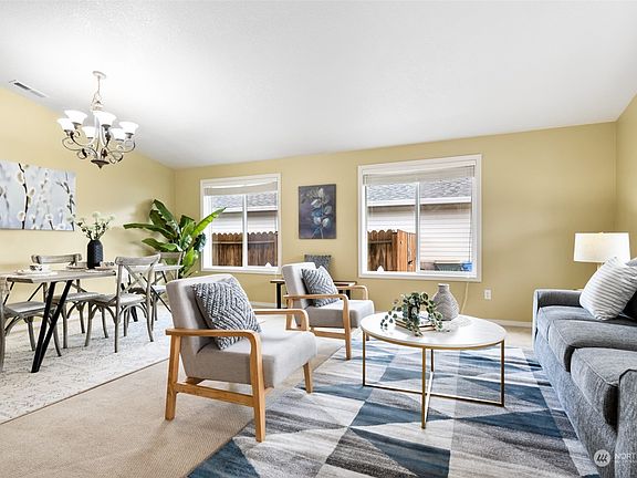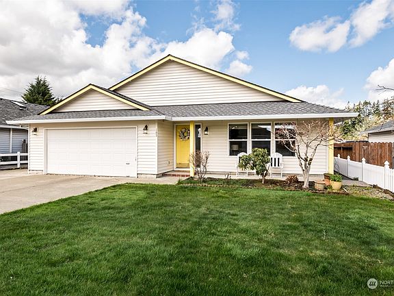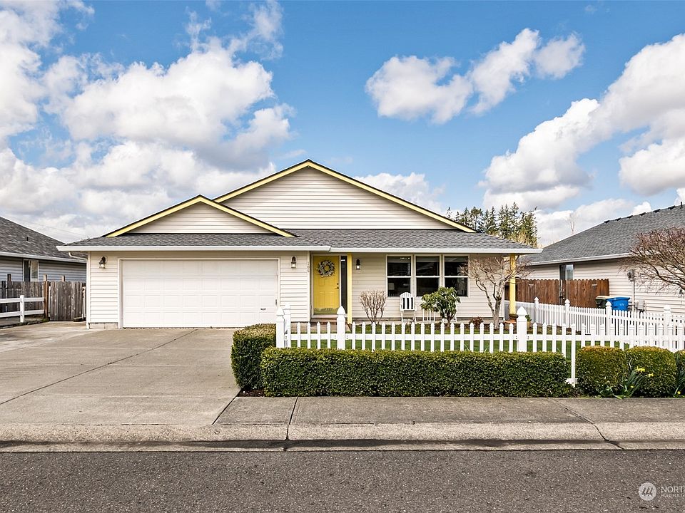 Welcome home! This charming, immaculately maintained, one-story light filled home greets you with a white picket fence and covered front porch. Featuring open concept living space, vaulted ceilings, skylight and desirable floor plan, this 3 bd, 2 ba, 1,672 sq ft beauty has it all. Inside, you'll find Quartz countertops, hardwood floors and gorgeous wood wrapped windows. Kitchen boasts bar seating and built-in buffet w/ marble countertop. Relax at days end in the primary ensuite w/ jetted tub and upgraded tile floor. Outside you'll find space for a trailer, yard shed, sprinkler system and more! Enjoy a cool summer breeze on the back covered porch that overlooks the privacy of a green belt. Easy access to I-5 and shopping. Won't last long!