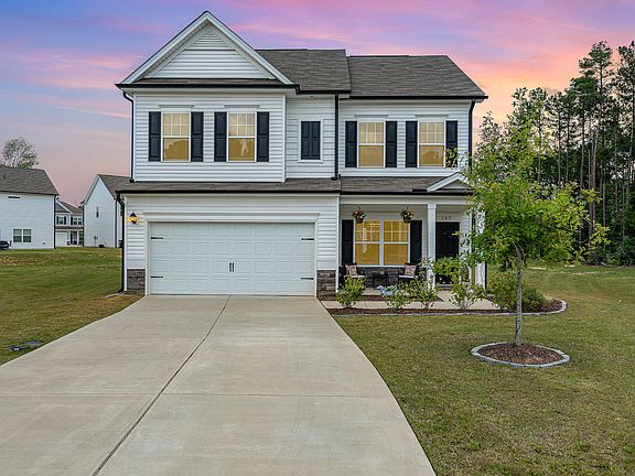 This stunning, better-than-new 4-bedroom home is situated on nearly .40 acres in a serene cul-de-sac in East Hampton. A welcoming rocking chair front porch invites you into an open and spacious floor plan, featuring a separate dining room or flex space for a playroom or office. The kitchen features 42-inch white cabinets, granite countertops, a subway tile backsplash, a deep sink, an island, and a breakfast nook with a built-in desk or coffee bar. Upgraded luxury vinyl flooring and farmhouse-style lighting throughout the main living area. Generously sized 4 bedrooms upstairs with a larger size laundry room. The private owner's suite includes separate walk-in closets, double sink with an oversized marble vanity, and a whirlpool spa tub/shower combination. Additional upgrades include upgraded carpet padding, accent walls, blinds, ceiling fans - Move in ready! The covered screened in rear porch offers a place to relax and enjoy sunsets - Perfect for entertaining!! Lawn care & maintenance is included in the HOA - No more weekends mowing! Located just 1 mile from HWY 70 bypass, this home provides easy living and a quick commute to Raleigh, Smithfield, I-40, and I-95. MUST SEE! Sellers just added an outdoor stone fire pit too!