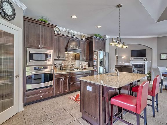 - RoomKitchenFeatures: Granite Counters, Kitchen Island, Pantry, Recessed Lighting, Fireplace, Eat-in Kitchen, Floors-Vinyl, Cabinets-Stained