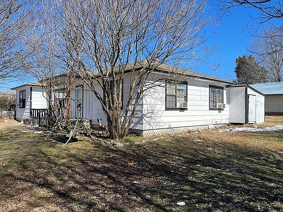 New paint on all of exterior and some of interior. Large work shop in backyard with 1 extra storage building. Storm cellar on site but will need door built. Large living and kitchen area. Original wood floor in some of house and new carpet in other areas. Tile in kitchen. Gas wall heater for heat in kitchen & living area. Window unit for bedroom areas. Custom built front brick flower garden along front of house. Located 1 block from Coweta Library. Realtors I will pay 3% for buyer.