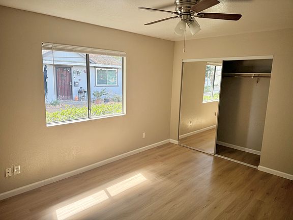 Practical layoutClassic hardwood flooringNeutral-toned wallsMirrored closet doorsCeiling fans