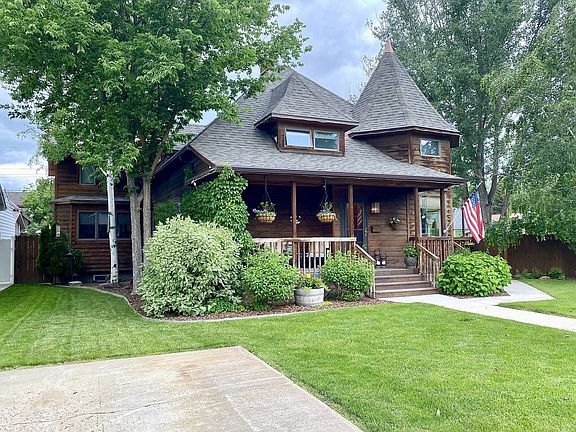 Stunning home with unique features and one-of-a-kind architecture. This 3 level cottage sits on a large corner lot in a desirable location- and is out of the flood zone! The beautiful exterior shows off the castle-like appearance of the home with the attached turrret and peaked roofs. The covered front deck makes an excellent sitting area. Walk in the front door to find the beautiful sitting room and formal dining area. On the main floor you'll enjoy the primary suite with a 3/4 bathroom (and heated floors!), living room, kitchen, family room or office space, and a full bathroom. Upstairs includes 3 additional bedrooms with unique vaulted ceilings and another full bathroom. The basement has large family room space and plenty of storage. There is a handy workshop in the backyard, as well as a detached double garage. Inside the privacy fence is a lovely patio area and well-kept yard, ideal for entertaining or relaxing outside. Timed drip systems across the yard allow for easy watering.