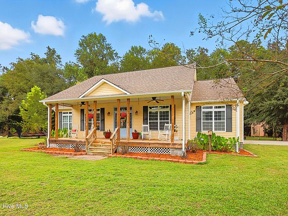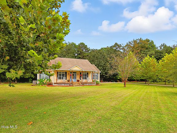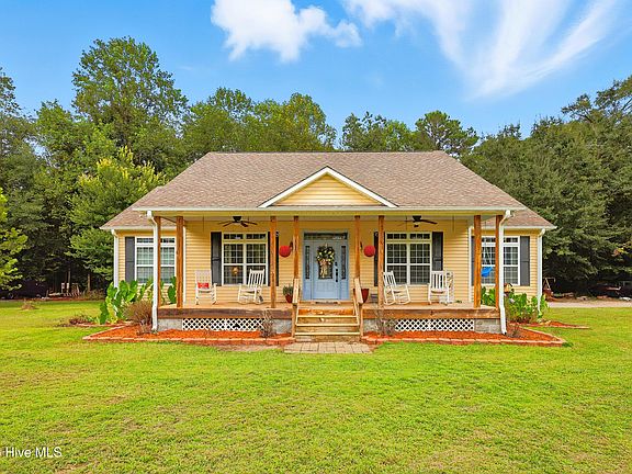 Nestled in the quaint Olde Branch neighborhood of Burgaw, NC, this beautiful 3-bedroom, 2.5-bath home sits on 2.1 private acres, offering both charm and space. The large, airy living room welcomes you with hardwood floors, a cozy fireplace, and custom built-in shelving. The formal dining room is perfect for entertaining, while the gourmet kitchen features custom cabinetry, granite countertops, a center island with cooktop and commercial stainless steel hood, stainless steel appliances, and a sunny breakfast nook.