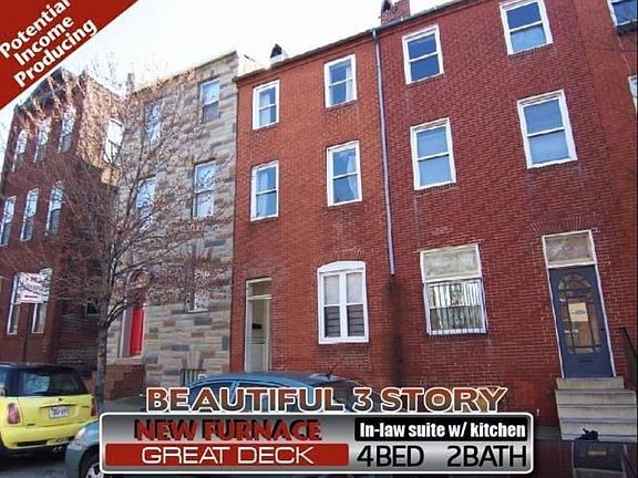 Beautiful 3 story rowhome in the heart of Butcher's Hill. 2 story spacious apartment with in-law suite on first floor. New furnace, deck, new bath, kitchen and living room. In law suite on first floor with separate kitchen, living room and dining room. Very nice property for both an investment and residence. Great Location near Johns Hopkins in Established Neighborhood.
