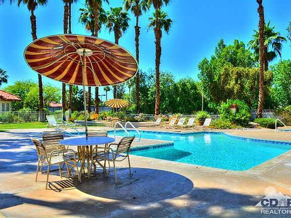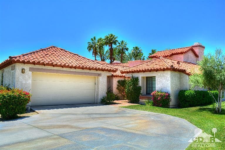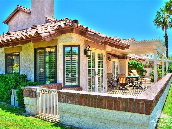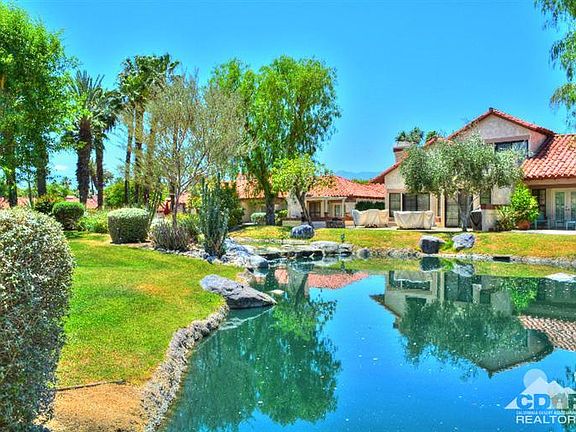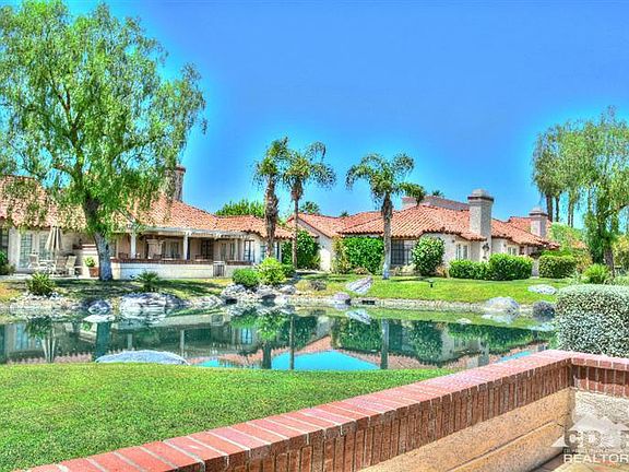 Fully remodeled, Single Story home in Prestigious Desert Falls CC! Pristine, Three Bedrooms, one set up as an Office/Den, Two Master Suites, one with large walk-in closet and the other with 2 separate closets, both with large Baths which were remodeled in 2016! Large Powder Room and separate Laundry Room. Gorgeous marble flooring! High beamed Ceilings in the Living Room with gas fireplace and open to the Dining Room. Kitchen that will knock your socks off! With nice, light Breakfast Nook overlooking pleasant stream/pond, grassy area and lovely back patio with shade structure. 5 sets pf French doors & windows have been replaced using high quality products! Circular driveway.. Tiled Entry Courtyard and back Patio are walled with gates. Fabulous! Very Bright, lots of natural light! Sought after Early California look on the Exterior, modern, beautiful and completely updated on the interior.