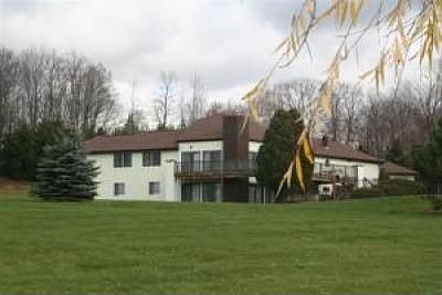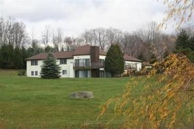 PRIVATE 13+ ACRE ESTATE PANORAMIC VIEWS~~POOL~~POND Be the first to inspect & enjoy this outstanding prop w/ exciting 5 bdrm, 3 ba Contemp overlooking its own beautiful grounds, fenced in-ground pool & pond. Blend of fields & woodland. Feats liv. rm w/ glass facade, vaulted ceilings, huge frpl, country kit w/ appliances, din. rm, fam. rm w/ frpl, billiard rm, patios, wrap around deck, garage