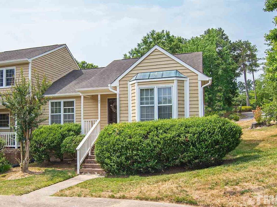 Woodcroft transitional end-unit TH, vaulted ceiling and fireplace in living room, 2 beds, 2 baths, & office. Freshly painted! Eat in kitchen has new counter tops. New roof installed 2017. Enjoy the natural light with vaulted ceilings in the living area and snuggle up close before the fireplace on cold winter nights. Relax & unwind on the large private rear deck after a long day! Extensive neighborhood walking trails, optional Swim/Tennis. Minutes to I-40 & South Point Mall. Close to RTP, Duke, & UNC.