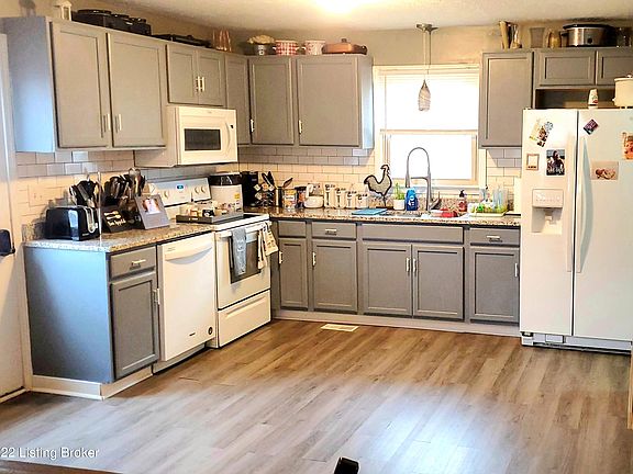 All brick ranch in Bardstown. Hard surface flooring throughout. Very desirable open floor plan. Sliding barn doors, beautiful accent lighting and shiplap paneled wall provide extra design details. Spacious kitchen with modern grey cabinets, granite countertops and subway tiled backsplash. Newly renovated full bath with marbled tile. Added half bath in Primary bedroom for extra convenience. Large fully fenced back yard.