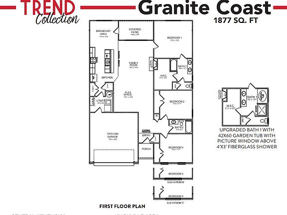 The Granite Coast, part of the Trend Collection by Ball Homes, is an open layout ranch plan with three bedrooms, and a versatile flex room off the entry. The island kitchen offers both a breakfast area and countertop dining, and a storage pantry. Granite kitchen counter tops with stainless teel 50/50 under-mount sink and full back splash. Stainless steel appliances including smooth top range, microwave and dishwasher. A covered patio is included at the rear of the home and sheltered by the primary bedroom and breakfast area wings of the house for maximum privacy. The primary bedroom suite includes a large walk-in closet, spacious bath with tub/shower and linen storage. Bedrooms two and three are off the entry hall, with access to the hall bath. Raised vanities in the baths. Job #4AA