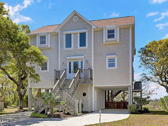 Nestled in live oaks and overlooking the marsh to the ICWW, this home is a hidden gem and perfect location for the buyer that enjoys peaceful serenity, sunsets, big sky, abundant wildlife, and the seasonal changes in wildlife and colors of the salt marsh over 1.73 acres. This home features many upgrades such as exterior cargo lift, appliances, hurricane shutters, hurricane screens across the second-floor deck, screened porch accessible by all 3 bedrooms on the 1st floor which has recently upgraded flooring. Easy walking or biking access to beautiful Topsail Island beaches, shopping, restaurants and of course don't miss out on walking the bridge over the ICWW that is only a mile from the entrance to the Sunset Harbor community. If traveling by air, Wilmington International or Jacksonville airports are only 30-40 minutes away. Peaceful and private, this natural sanctuary allows you to enjoy both sides of the island the wonderful sunsets over the marsh, or breathtaking sunrises over the beach.