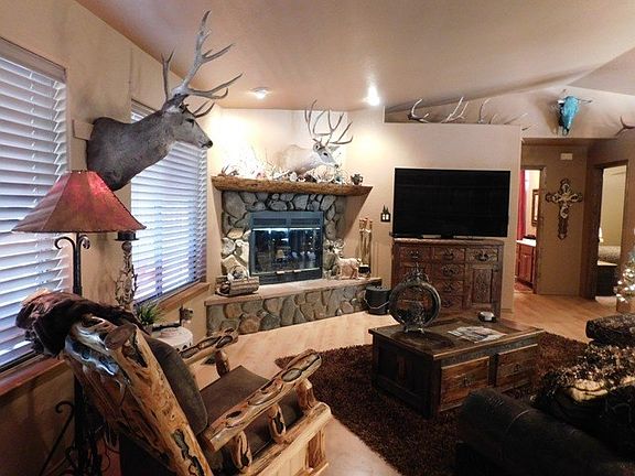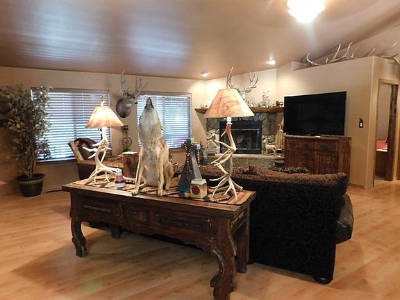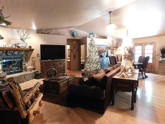 Beautiful single level mountain home in the pines with a guest house. This 3 bedroom 2 bath home is selling fully furnished. The guest quarters has a fireplace and kitchen/coffee bar and bath. Beautiful treed extra large lot is almost 3/4 of an acre. Both covered and uncovered decks for enjoying the outdoors. Many deer visit frequently. Attached 2 car garage with plenty of parking. Great vacation home or full time residence. Property is in excellent condition. Refrigerated air, fireplace and central heat. Move-in ready. Take a look!