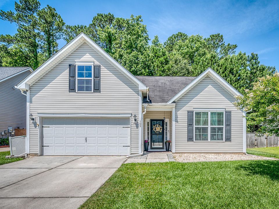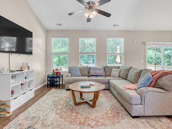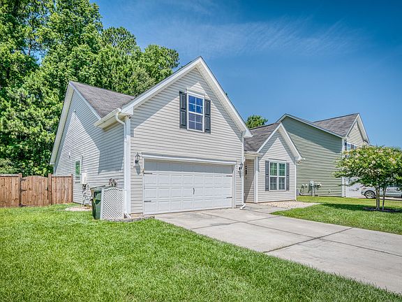 Located in the quiet community of Sophia Landing, you'll be living large in this gorgeous home with its open and spacious floor plan with soaring ceilings. The kitchen features stainless appliances, a gas range, island, plenty of storage, and adjacent dining area. Three large windows and a slider fill this area with plenty of natural light and provide a beautiful view of trees and nature. The open family room has enough space for even the largest sectional! The primary bedroom, which is separated from the second bedrooms, has a tray ceiling and is absolutely huge! The primary bath and walk-in closet are also very spacious. Two secondary bedrooms are located toward the front of the house and share a hall bath. Upstairs is a fourth bedroom with its own walk-in closet and full bath. Outside you'll find a large deck overlooking the fully-fenced yard lined with trees. The community offers a pool and playground which are just a short walk away, and the home is conveniently located in the heart of Goose Creek with just a short drive to the Naval Base/Joint Base, Community Center, parks, and major highways. Owners are in the process of removing/painting some of the bolder colors.
