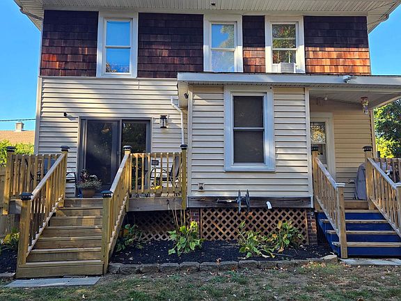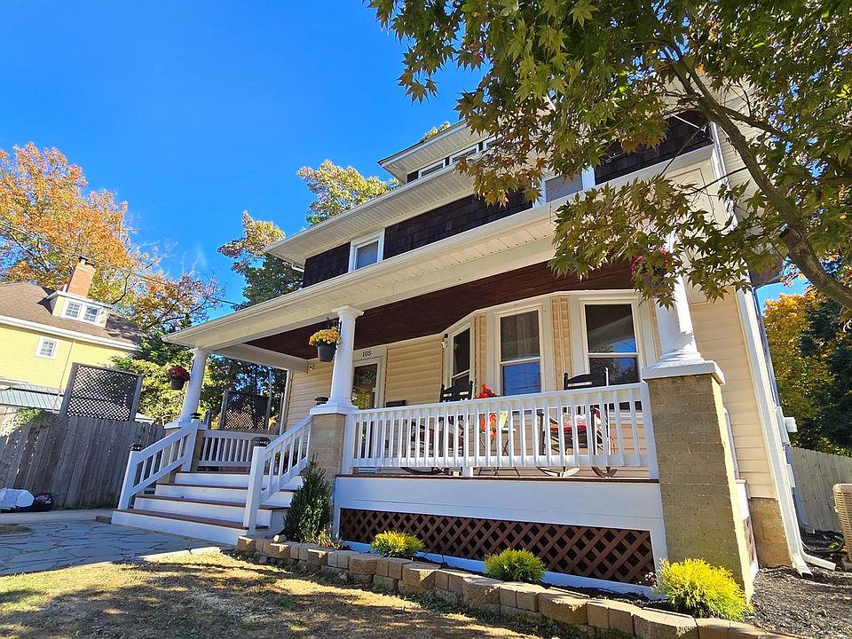 This Craftsmen style home is sure to please with the charm that begins with the beautiful, newly redone front porch. Once you step inside you are greeted with a slate foyer and newly refinished hardwood floors in the living room with windows galore. The large dining room also is sure to please that overlooks the private backyard accessible through sliding doors to and porch to sit and enjoy the serenity. The kitchen offers a pantry, plenty of work space and access to the backyard and yet another porch. Make your way to the second floor on the newly carpeted stairway, this offers 4 bedrooms and a full bath. Venture to the 3rd floor to find your oasis of a primary bedroom or use of whatever your family needs. The vaulted ceilings, sky lights and large space make for a peaceful retreat of any need. The furnace and central air are newer (2020) and water heater is 2years old. Offers due by Nov. 21st by 5:00pm