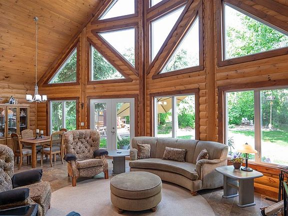 Treed lotLog-style homeRustic charmModern comfortsSoaring ceilingsStriking stone fireplaceSpacious kitchen