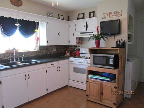 Spacious & cute 3bed/2bath home! NEW windows, roof, heat unit in last 5yrs. 2nd 17X20 space off garage for whatever you wish. Lrge kitchen; range/fridge/washer/dryer stay, 12X20 storage bldg in back fenced yard. Walking distance to splash pad!