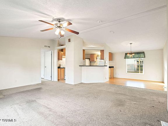Located in family friendly park, is this newer 2003, 3 bedroom, 2 full bathrooms, 1566 sq. ft. manufactured home. Vaulted ceilings, spacious kitchen with lots of counter space and storage, small pantry. Separate laundry room, washer and dryer stay with the home. Split floorplan with primary bedroom on opposite end of the home, with walk in closet and full bath. Home has both living room and family room, 2 guest rooms. 2-car carport with small, fenced yard. Pets are approved, please see park rules for restrictions. Water Sewer Garbage is billed with the lot fee, which is currently $495.00 per month. Please be aware you must be approved by Park Management.