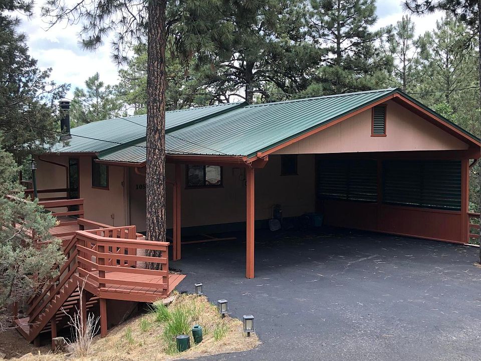Walking Distance to Mid-town. This super cute and clean cabin is ready for your buyer! Enjoy the cozy wood burning fireplace on the cool mountain nights and the refrigerated air on the warm sunny afternoons! There are two covered decks overlooking two beautiful wooded lots that are also included with the sale of this home along with one uncovered spacious deck at the entry level. Master bedroom upstairs. Down stairs you will find 2 additional bedrooms, full bath, laundry and a den with access to one of the covered decks. This home features a double attached carport with ample paved parking. Lots of storage under the house with a locking door.