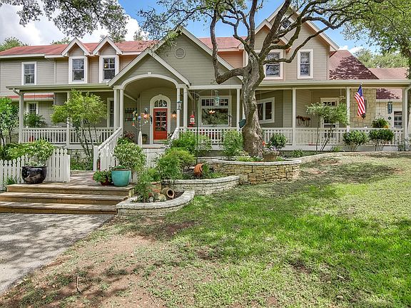 Traditional Hill Country Estate on Almost 12 Acres with Guest Home, Pond, Rustic Workshop, Historical Outbuildings, Corral, Fenced and Cross-Fenced. This builder, one-owner estate for over 30 years, offers some amazing architectural features and truly stunning land/trees. This one of a kind designer home features large glass areas, which allows much natural light to showcase the outside beauty of rolling green pastures and 200+ year old oak trees. Master and study down, two bedrooms & bonus room upstairs.