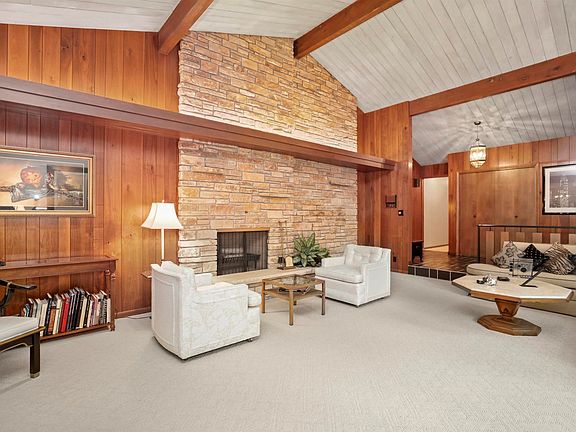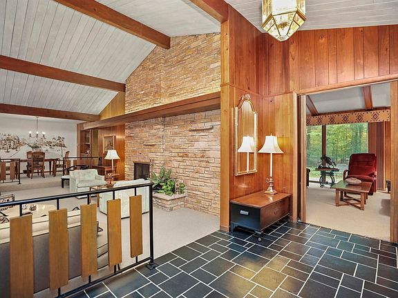 Custom home designed by architect Ray Prell inspired with a Frank Lloyd Wright Style. Double doors welcome you to a large foyer w/ slate floor. Spacious formal LR & DR w/ vaulted ceilings. Eat-in Kitchen with center island. Sliding door leading to a beautiful stone patio overlooking the landscaped .94+/- acre lot w/ wooded backdrop. Adjacent FR w/ built in cabinetry. Two wood burning FP's flanked w/ weather edge stone, MBR w/ double closet & full BA, 3 additional BR's & full BA, laundry room & 1/2 BA complete this home. Attached 2 car garage w/ epoxy floor. Showings start 10/18/2021.