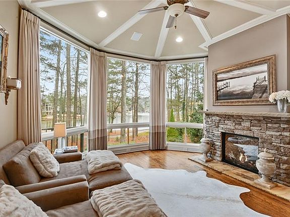 Quite sophistication... Bay Pointe, this master on main home offers breathtaking lake views from almost every room. This designer show home is in pristine condition and completely remodeled. Expansive stone hardscaped backyard features a huge fireplace, koi pond and overlooks the Golf Club of GA and Lake Windward. New roof 2015, 2 new HVACs, dramatic rod iron staircase, immaculate hardwood floors floors throughout. Fully finished terrace level offers a home theater, wine tasting room, and large entertaining space which opens to outside terrace.