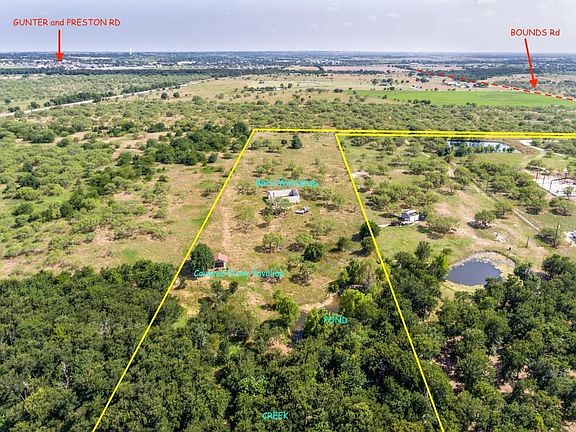 Fabulous opportunity to own almost 9 acres to build your dream home, a mini ranch or a weekend getaway close to the metroplex. Very private and secluded, but right in the mix of North Dallas corridor. Close to Dallas North Tollway, Preston Road, HWY 380 and HWY 121. A beautiful hidden gem with mixture of pastures, trees, pond and creek running through the back of the property. Highly rated Gunter ISD. This property has a gorgeous stone gate and a large stone barn shell along with a shaded picnic pavilion. Back 20% is heavily wooded with a creek running through the woods. So many options available to you. Grayson county offers an AG exemption for keeping Honey Bees with a minimum of 5 acres.