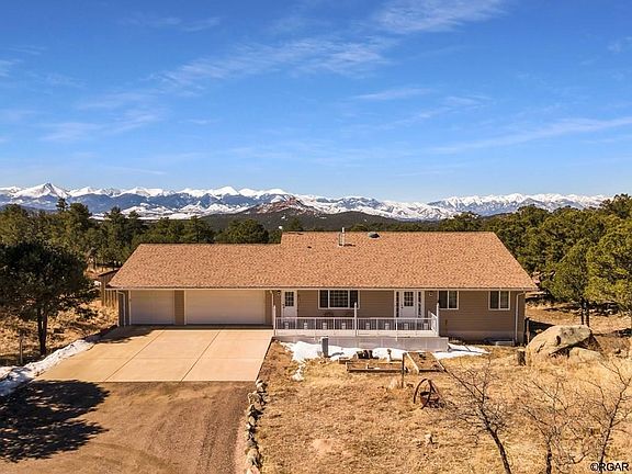 CUSTOM WALK OUT RANCHER with "obvious pride of ownership" on 5.32 acres gorgeous acres and incredible views of the 14,000 ft Sangre De Cristos. 5 large bedrooms with 4 baths! Master bedroom has a beautiful corner gas fireplace and spacious bath with slate tiled shower and large walk-in closet. 2nd main floor bedroom also has attached full bath. Kitchen cabinets are beautiful pecan with lots of quartz counters, a center island for entertaining. Living room has aspen ceilings, corner gas fireplace, and large windows to take in the snow capped views. Hallways and door ways are wheelchair accessible ie 36". 3 car garage with a 30x24 shop in the walkout. Newer 32x42 metal building/ shop, heated with 3ea 12 foot doors and a whole house back-up generator. Basement has a huge craft room, reloading room, 3 bedrooms, bath, exercise room, and rec room. Whole house water filter and softener, cell phone works here too! Lots of decking to breathe in the fresh air and a hot tub to soak away your worries.