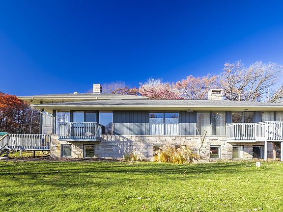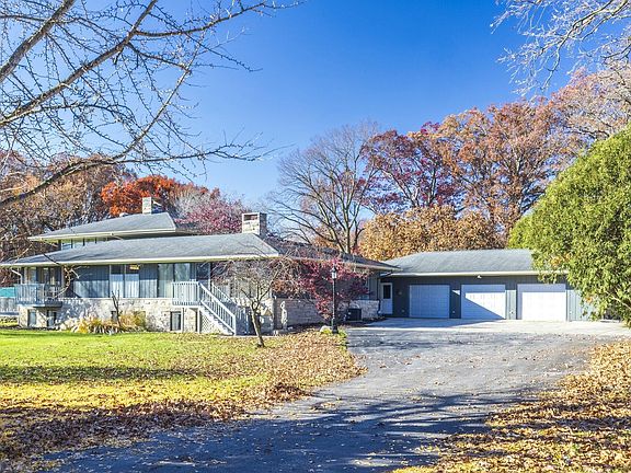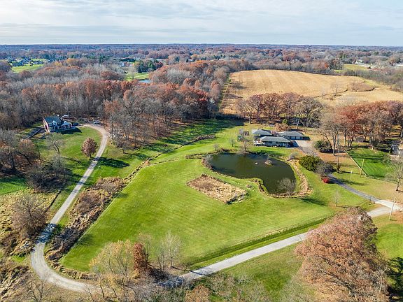 Beautiful Prairie Style home located on 6.14 Acres in a quiet small neighborhood! Valparaiso Schools: Heavilin Elementary & Ben Franklin Middle School. This unique home sits on a gorgeous lot full of mature trees, 5/8 acre pond, 3 Car garage, 16x24 Pole Barn, and optional related living area. As you enter the courtyard, a Koi pond and a beautiful Dogwood tree fill the space with shade, color, and serenity. As you step inside the home, the Hickory wood floors give you a sense of comfort and warmth. The placement of the windows make each view feel like you are outdoors. The kitchen offers granite countertops, Whirlpool, LG, and JenAir stainless steel appliances. The livingroom has high ceilings with a gorgeous stone fireplace and live edge wood mantel. A loft area above this room with spectacular views of the property! A primary suite all on its own level with warm 3/4" hickory wood floors. The primary bath has a granite double vanity and a free standing soaking tub. A separate toilet and shower area are located in the space as well. His and hers closets with one large walk-in closet. A large mudroom is located as you come in from the garage offering plenty of room to keep organized. The spacious laundry room is located near the mudroom area. An additional 4 bedrooms and a flex room make this home easy to spread out. A large screened in porch with a hot tub is located off the back of the home. Doggy door and fenced in back yard make it convenient for a furry friend. An optional related living space can be utilized if need be. Zone controlled HVAC system: new furnaces & a/c units, new outdoor wood furnace, several new windows, and solar panels make this home extremely efficient whichever the season. The variety of mature trees on the property and the amount of natural light throughout the home makes this home feel like a RETREAT!