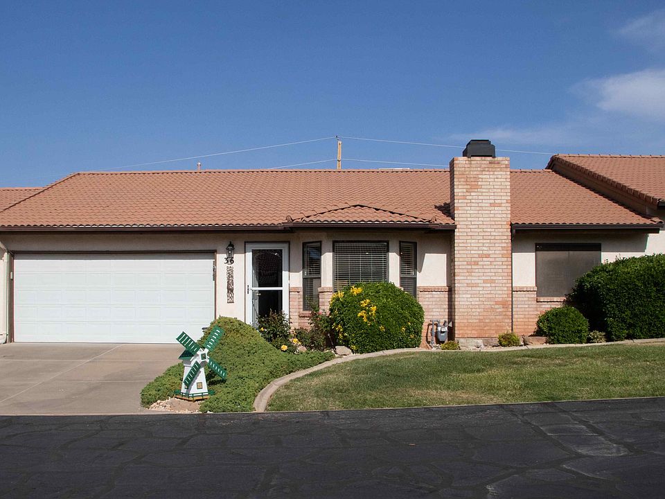 Enjoy low maintenance and nice amenities in this one-level open concept home in a 55+ community. Experience southern Utah's warm weather sitting by the community pool or playing pickleball at the community pickleball court. This home features updated flooring, Corian countertops, a garage workshop, handicap-accessible tubs, covered patio with shade screens. This neighborhood is close to restaurants and the freeway. Subdivision is Bloomington Knolls but that choice was not available so it shows Bloomington.