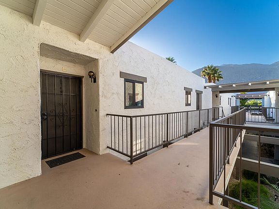 Welcome to Ramon Estados in Palm Springs - a stylish and low-maintenance desert retreat ideally situated in central Palm Springs. This inviting upper-end unit boasts 2 bedrooms and 2 full bathrooms, providing an elevated living experience with impressive vaulted/beamed ceilings and an abundance of natural light from three sides of windows.The updated bathrooms feature new tile, lighting, counters, and showers, while the sparkling kitchen showcases newer appliances. Newer double pane windows with thermal and sound protection enhance the living experience, adding both energy efficiency and tranquility to the space. The master suite offers a walk-in closet and a delightful view of the pool. Step onto the large covered balcony with a storage closet, where you can relish tranquil views of mountains and sunsets.Ramon Estados is not only a residence but also a vibrant community with an active pickleball community. Join in the fun and socialize with neighbors in this engaging and welcoming environment. The community, comprised of 134 units, offers resort-like amenities, including 2 heated pools and spas, tennis courts, and a clubhouse with a fireplace. Laundry convenience adds to the ease of living.Benefit from a walkable location and the convenience of being minutes away from Downtown Palm Springs. With the lease extended to 2076, financing is available, making this an excellent investment opportunity. Experience the beauty and comfort of Palm Springs living at its finest