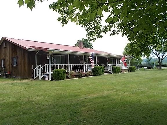 PRIVATE, PEACEFUL AND QUIET GENTLEMAN'S FARM. The well kept one level home, overlooking 59.12 picturesque acres, features many updates including wood flooring, tile flooring and kitchen appliances. The dining area connects to a deck for enjoying the view of the farm and there is a 53' front porch and covered back deck for enjoying nice weather, watching birds and a wildlife parade on occasion. The outbuildings include 6 garage bays, stables, shop, tractor barn, carports and RV pole barn. Car collectors and those with hobbies will enjoy having ample space for storing possessions. Hay fields are managed at no cost to owner, adding to the enjoyment of the farm. Carpet and decorating allowance negotiable.