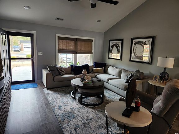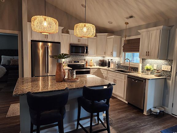 No HOA. Our Beautiful  home boast 3 bedroom 2 bath with a backyard Oasis perfect for entertaining  located in a quiet neighborhood only 3 miles from Historic Downtown Conway. Home features open floor plan with LVP flooring throughout, granite counter tops, stainless appliances, tiled showers, master has his and hers closets, brick exterior, irrigation system, large driveway can park up to 9 vehicles or 6 with room for an RV and 2 car garage with custom shelving. Your paradise awaits in your outside kitchen featuring stainless built-in grill, blackstone grill, pizza oven, fridge, sink, 6 bar seating, tiled floor, electric fireplace, TV,  ceiling fans.  There is beautiful low maintenance landscaping, firepit, semi-recessed pool, custom surround stereo and complete pvc fence for privacy.   2388 total square feet. Lot size .40 acre.