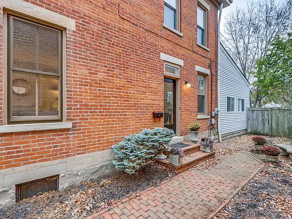 Olde World Charmer on Schiller Park meets New World Living. Brand New kitchen: New cabinets, New stainless steel appliances, subway tile backsplash, eat-at granite counters, coffee bar with wine cooler. Entertainers delight. High ceilings on upper 2 lvls, German Village period windows, Cozy living rm looks out to the Park, built-in shelves flank ventless gas fireplace. Hardwood on main level. Spacious dining rm and built in pantry. Beautiful side door w/ decorative transom. Exposed brick wall in upstairs ensuite bedroom. Spacious 2nd bedroom, 2 closets. Full Basement with head-height ceiling. Private backyard, large deck for gatherings (access through sliding kitchen doors), nice deep yard with paver patio and raised garden boxes. Detached two car garage accessed off alley.