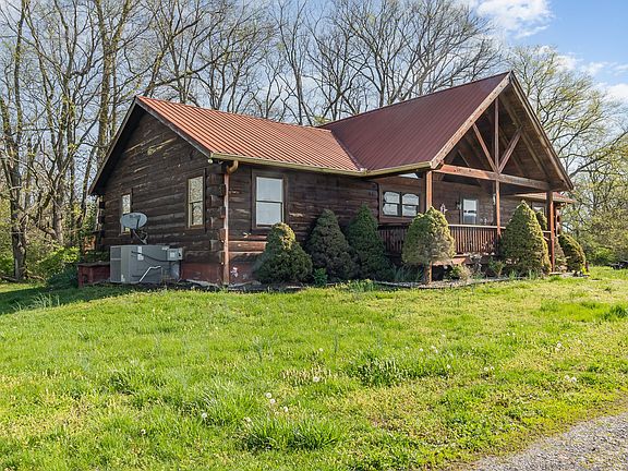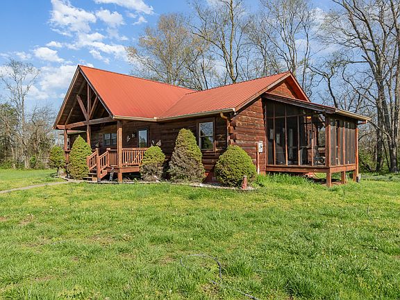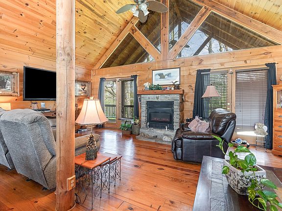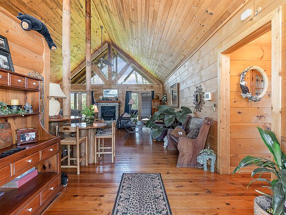 Set on 12 acres alongside a tranquil creek, this stunning log cabin features soaring ceilings and a luxurious master suite with his-and-hers bathrooms. The beautifully finished detached barndominium offers endless possibilities as a guest house, workshop, or entertainment space. Surrounded by nature, this property provides the perfect retreat for relaxation and enjoyment.
