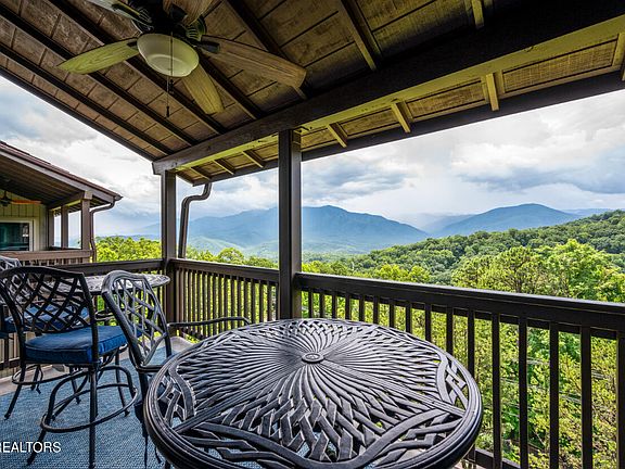 This home features incredible views of the Great Smoky Mountains! Raven Crest Condominiums is one of Gatlinburg's best kept secrets. High atop Chalet Village, It's a refuge of peace and tranquility with striking views of the Smokies to the South, Gatlinburg to the East and the Tennessee valley to the North. The site itself is a level ridge top with natural rock outcroppings and beautiful sunrise views. Most of these units are used as second homes. Short term vacation rentals and long term leases are not permitted, which helps preserve the integrity of the complex and its serene environment. They've been built to a very high standard, with solid concrete construction and a new metal shake-look roof that's hurricane and fire resistant. This top level unit has vaulted ceilings, a floor to ceiling mountain stone wood-burning fireplace, along with beautiful views of Mt. LeConte and Ober Mountain Ski Resort. It has been completely remodeled with details such as, custom hand carved wood mantel, glass fireplace door, open concept great room, kitchen with bar and adjacent dining area, built-in shelving, granite kitchen counter tops, tile backsplash, high-end stainless appliances, upgraded light fixtures, laminate flooring in kitchen/den/dining area/hallways, bathrooms remodeled with custom showers and shower doors, vessel sink, oversized walk-in shower and washer and dryer. One of the best parts of this beautiful unit has to be the large, southern facing, covered deck overlooking the Smoky Mountains and mature native rhododendron. It's a perfectly positioned really unit in a lovely complex that makes a perfect family retreat. 100% replacement insurance included in HOA fees, along with internet, cable, and trash collection! This spring/summer a beautiful new gate will be added at the entrance for additional peace of mind and beauty.