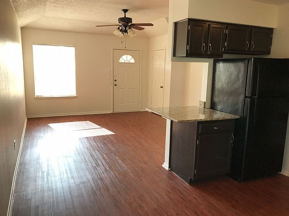 Roomy single story 2 bed 2 bath Duplex. Nearby bike and running trails, schools and parks. Beautiful wood-like floors throughout and 2-inch blinds. Kitchen comes with granite countertops, electric range, refrigerator, dishwasher and garbage disposal. Includes a private back yard with privacy fence and rear covered parking for 2. Includes front yard mowing. A must see.