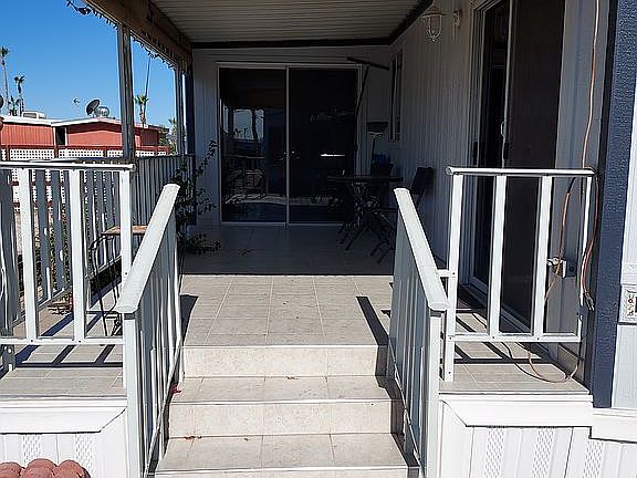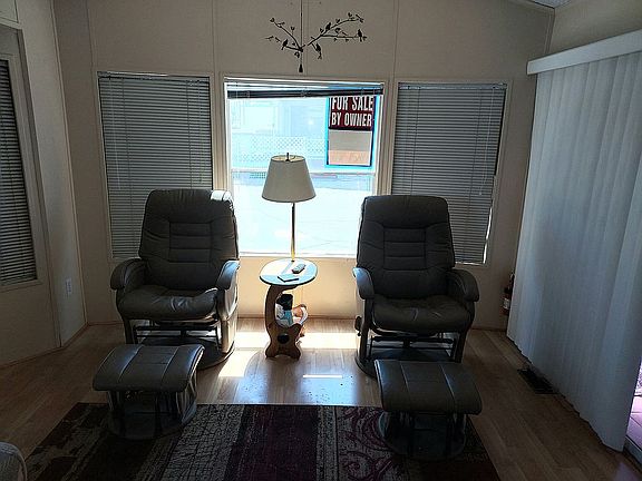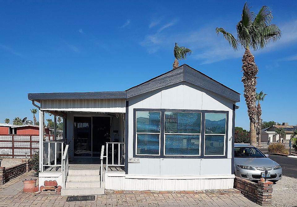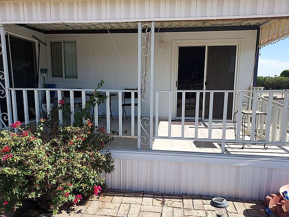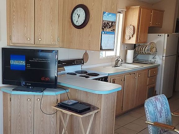 PALM HARBOR modular home with Arizona room and covered patio with table and 6 chairs. Attached storage unit that can be used as a shop.Corner lot close to all amenities excellent condition. Comes fully furnished. Electric stove, refridgerator, microwave. Arizona room has solid wood queen murphy bed with large desk/work table when stored. 2 recliners and kitchen table with 4 chairs. Main bedroom has queen bed and lots of built-in storage. Full bathroom and additions.