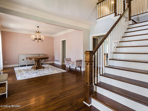 The back yard boasts a cleaned-up wooded area, patio space, and an electric fence with no collars. The property also features Leafguard gutters and a front and back irrigation system. The garage provides ample space for three parking spots, and there's a large storage room that could be a perfect wine cellar or bourbon room.