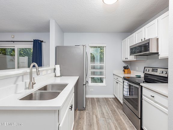 Back on Market - Buyer Could Not Perform! Don't miss this beautifully updated concrete block end-unit with a 1-car garage in the highly sought-after Mandarin area. In addition to interior updates, the home features a brand-new roof and upgraded energy-efficient windows. The 1,707 sq ft floor plan, complete with vinyl plank flooring, offers a seamless flow. The main living areas—living room, dining room, and kitchen—are conveniently located on the first floor, along with a half bathroom, perfect for guests. Upstairs, you'll find three bedrooms, two full bathrooms, and a versatile loft space, ideal for a home office, TV room, or playroom. The kitchen has been recently refreshed with quartz countertops, freshly painted cabinets, and new hardware. The primary bedroom includes a walk-in closet and an en-suite bathroom. Situated between San Jose Blvd and Old St Augustine Rd, everything you need is just a 5-minute drive or a 10-minute walk away! Reach out to schedule your showing today!