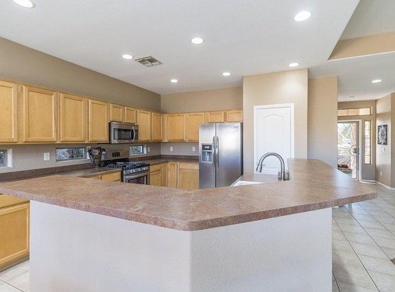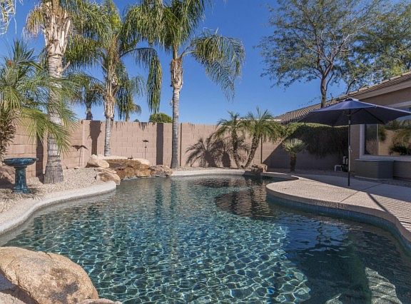 Great one-owner family home with 3 bedrooms + den & 2 baths in 1882 SqFt. This home sits on a beautifully landscaped 1/4 acre homesite & has a sparkling pebble tec pool w/rock waterfall. The kitchen opens to the great room & features maple cabinetry, 5-burner gas range, stainless appliances, island w/breakfast bar & pantry. Sliding doors lead out from the dining area to the covered patio & backyard with fenced pool & lots of grass to play on. Split bedrooms; the spacious master has private bath w/ dual sinks, separate tub & shower & walk-in closet. Other features include 3 car garage, new exterior paint, newer interior paint, solar water heater, owned solar panels (10-25% utility savings), surround sound in great room, master & den, stacked stone exterior accents & more! See today!