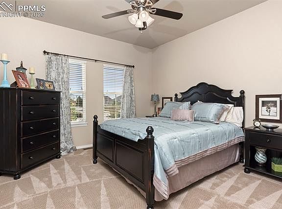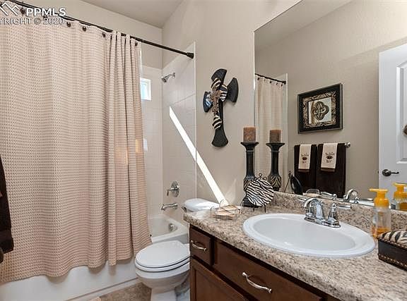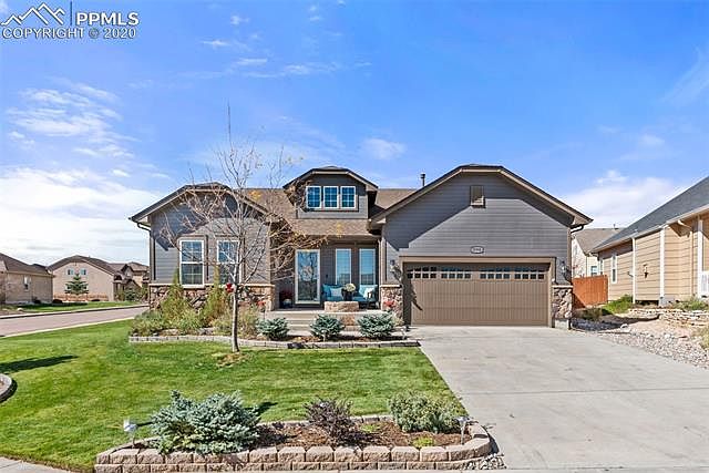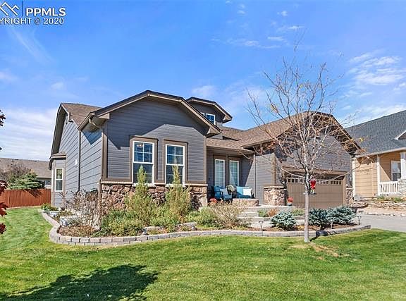 Welcome Home! This beautiful home features 5 beds, 3 baths and 3 car tandem garage. Open concept main level living with stunning hardwood flooring, vaulted ceiling, arched entry ways and built ins. Enjoy entertaining in the spacious eat in kitchen with SS appliances, gas range and tons of counter and cabinet space as well as walk in panrty. The living room is open to the kitchen and dining and features vaulted ceilings, gas fire place and walk out to back yard and patio. Spacious master bedroom baosts vaulted ceilings, 5 piece master bath with large soaking tub and huge walk in closet that has direct access to the main level laundry. The main level also features a guest bedroom and shared full bath. Downstairs you find a huge family room with custom wet bar that features stacked stone surround, wood bar top and wood laminate flooring. There are 3 additional bedrooms and shared full bath that boasts a double vanity. There is also plenty of storage in the unfinished space located in the basement. This home features goregous lush landscaping in both the front and back yards and is easy to maintain with the auto sprinkler system. Don't be fooled... this is a 3 car tandem garage. The roof and exterior paint are NEW! This home is located in the desireable Meridian Ranch neighborhood that features a Recreation Center and Pool. Located close to golf course, parks, trails, schools, shopping and entertainment and just minutes from Colorado Springs. This home is a MUST see!