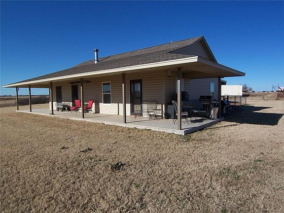 Talk about "Home On The Range", this is it! Nearly new 3 bed, 2 bath, 2 car garage home is beautiful! You'll love the views from the large, wrap-around porch. The custom-built, triple fans will let you spend comfortable afternoons there, even on the hottest days. Walk in to the large, open living area. The woodwork and trim is gorgeous and stained out to give the home a warmth that makes you want to stay awhile. The engineered hardwood floors are a great compliment and are easy-care. The kitchen opens to the living and dining area giving the home a casual, welcoming feel. Off the kitchen is the large laundry room with pantry wall and there's even an office area! The bedrooms are all large with nice-sized closets and two of them have doors to the outside. The two car garage is over-sized and has an attic fan to keep the air moving on those hot summer days. There's a big pole barn that's approximately 31 x 42. The Conex box shipping container can stay with a full-price offer.