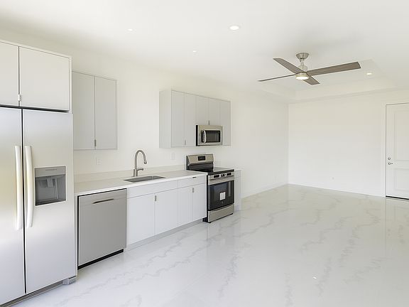 This 900 sq. ft. home includes porcelain tile floors, a fully equipped kitchen with stainless steel appliances, washer and dryer inside the unit, and modern lighting throughout.