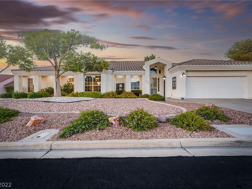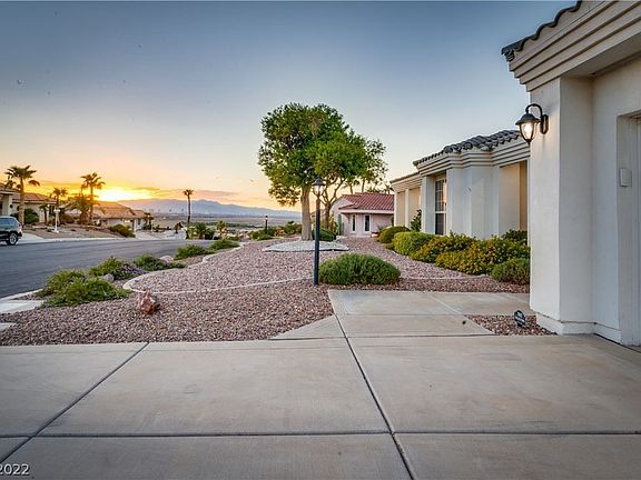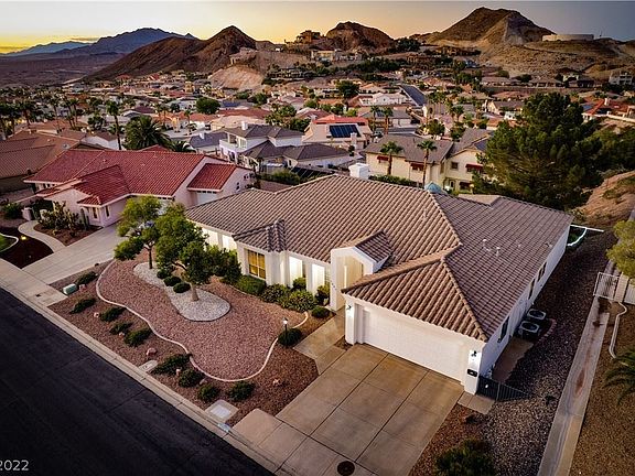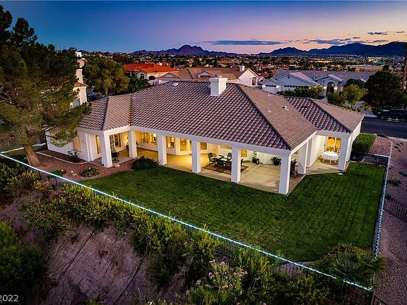 Top of the world VIEWS front and back! WELCOME HOME to this gorgeous custom built ranch home located on nearly 1/4 acre with mountain, city, and Strip views. From the moment you step through the front door, you will enjoy taking in the amazing views and natural light created by vaulted ceilings and tall picture windows showcasing the oversized backyard. The home boasts 3 bedrooms plus extras like an office/den with built-in shelves and dedicated laundry room. The kitchen offers ample counter and cabinet space, w/ stainless steel appliances. The primary bedroom suite is separate from others, w/ dual sinks, 2 walk-in closets, and separate shower/jetted tub. The best is to come when you step into the backyard, where the expansive wraparound covered patio offers tons of space for outdoor seating and dining enjoyment PLUS endless views of the sprawling lawn, mountains, and sky. All this, located in Calico Ridge, close to daily conveniences while also tucked away for comfort and tranquility.